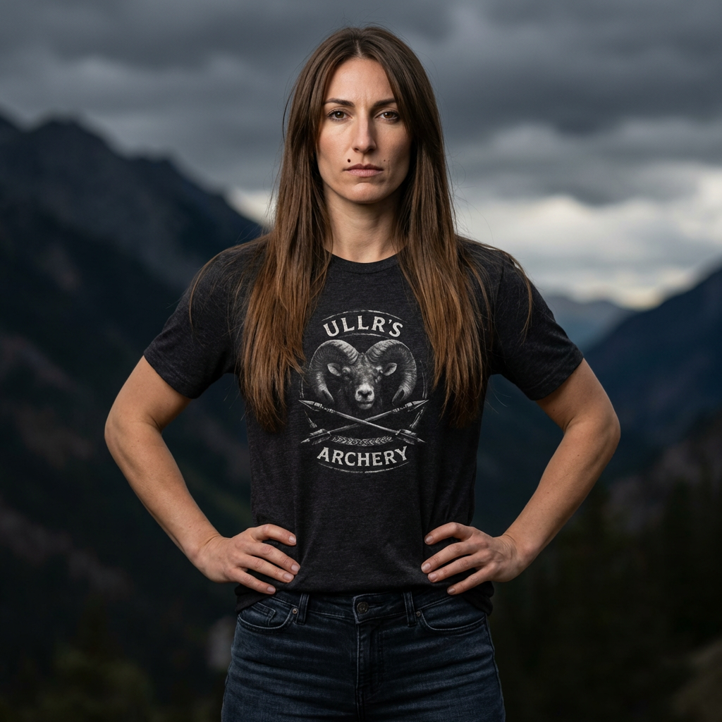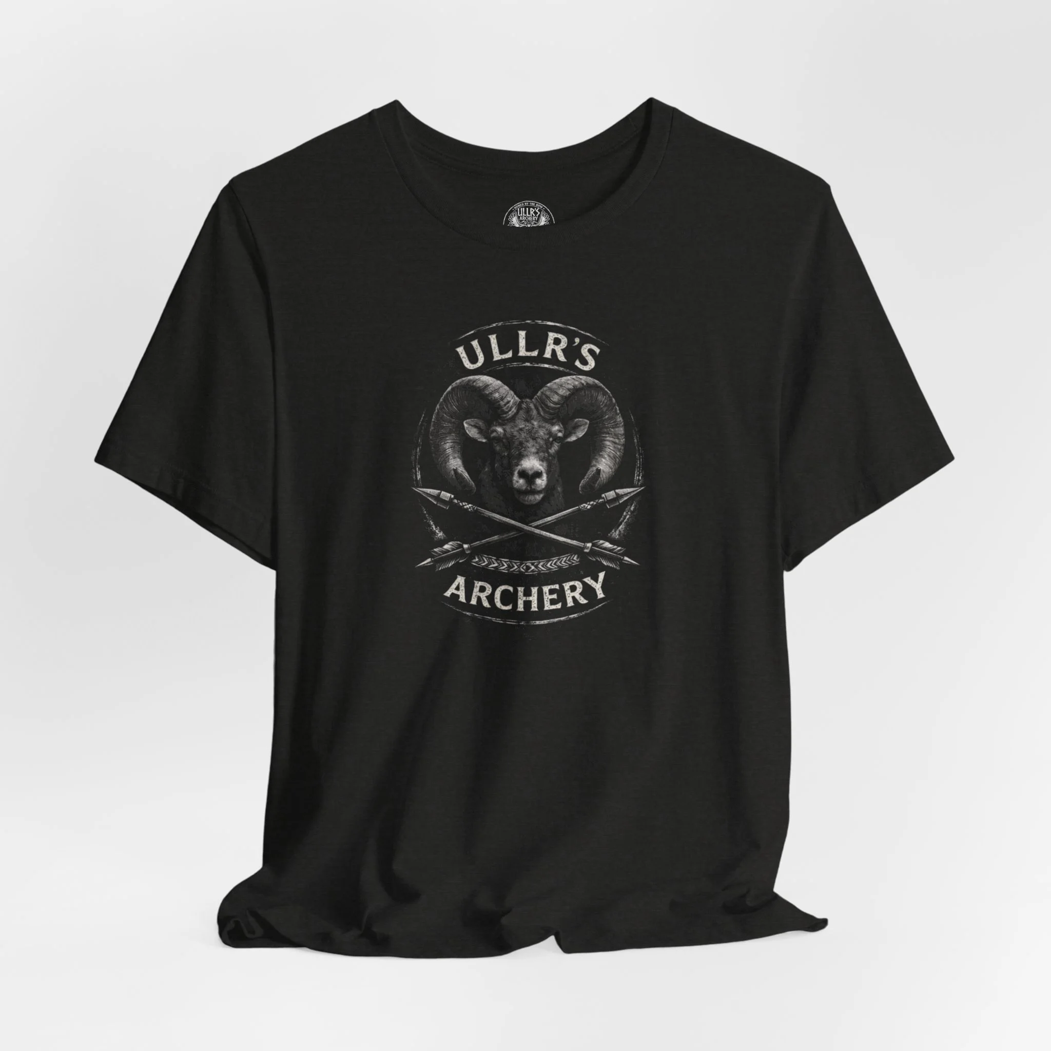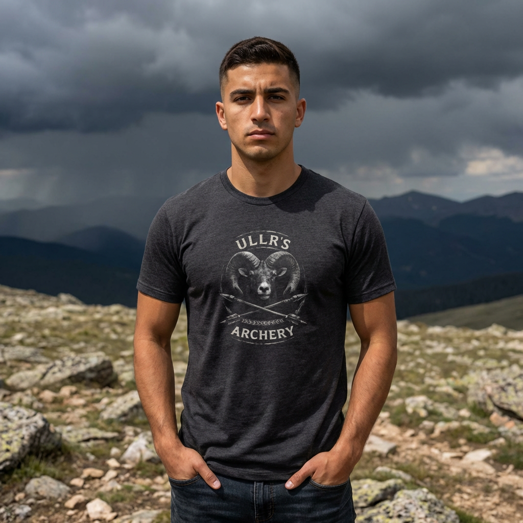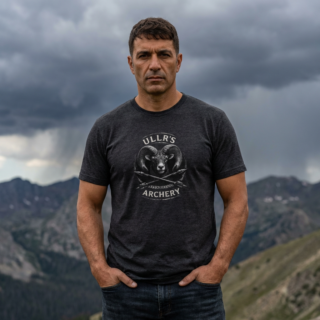 Soft, breathable tee with a weathered archery crest that feels lived-in from the first wear. The front features a bold ram’s head above crossed arrows and the lettering “Ullr’s Archery,” while a smaller, matching circular mark sits between the shoulder blades on the back. Wear it on range days, trail hunts, or around the shop — it layers easily under a flannel or pairs with work jeans. The vintage distressed print gives a quiet, rugged look that reads like a club emblem: low-key, confident, and earned.
