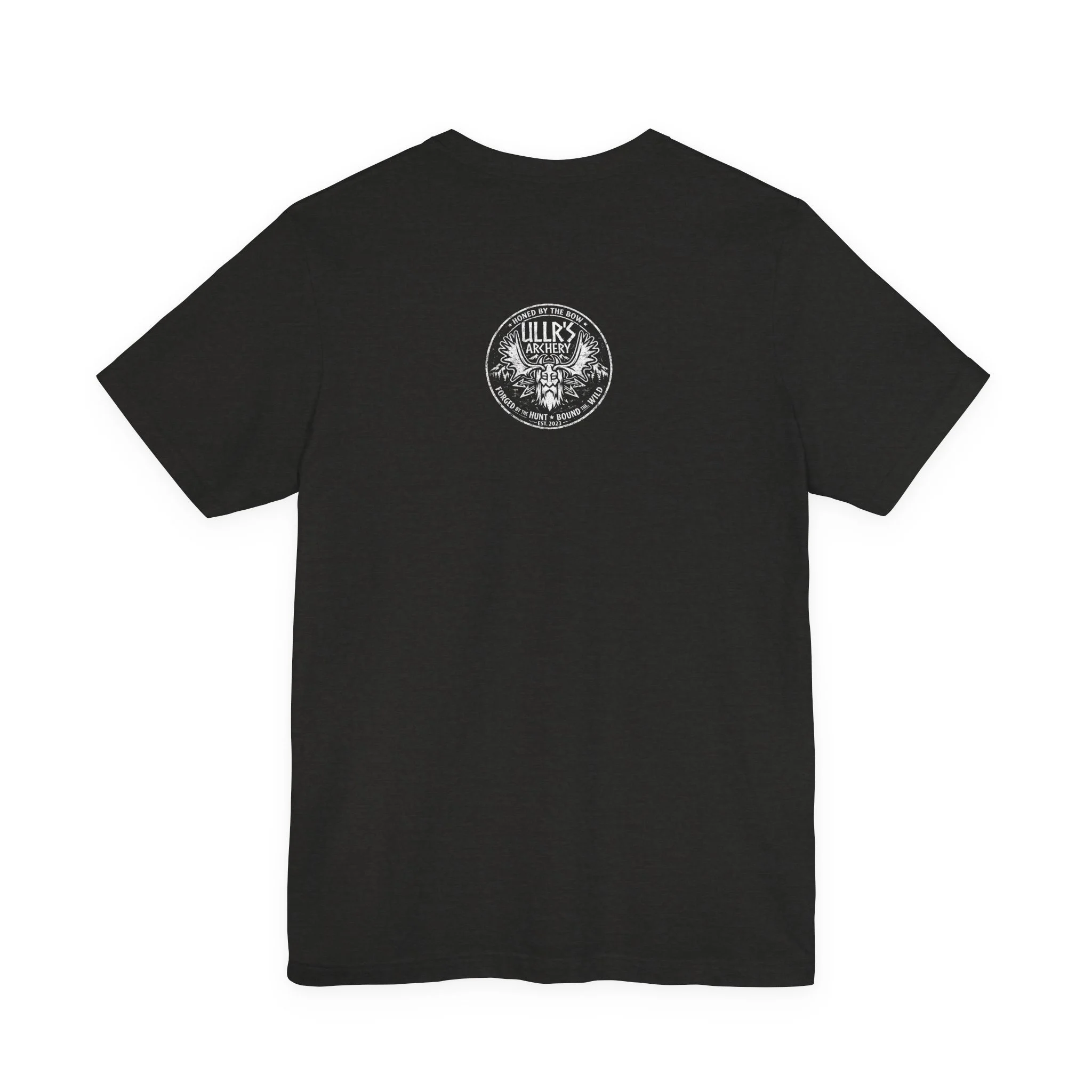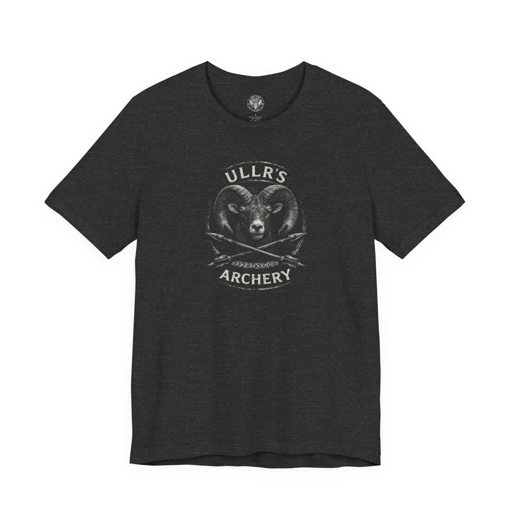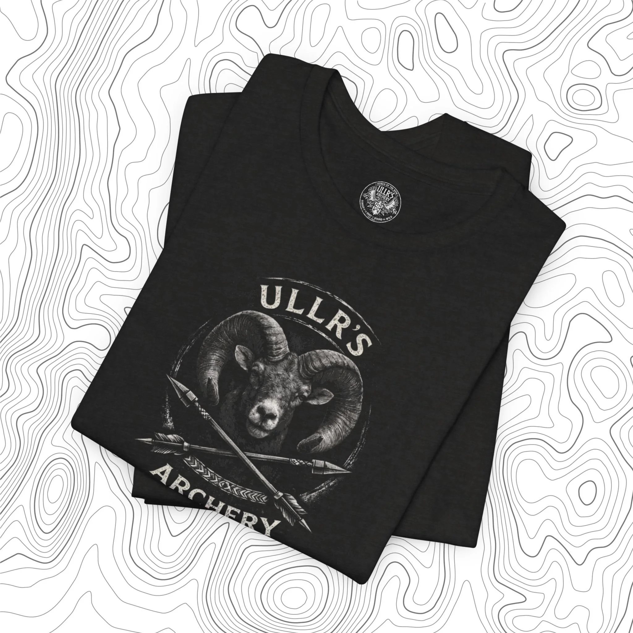 Soft, breathable tee with a weathered archery crest that feels lived-in from the first wear. The front features a bold ram’s head above crossed arrows and the lettering “Ullr’s Archery,” while a smaller, matching circular mark sits between the shoulder blades on the back. Wear it on range days, trail hunts, or around the shop — it layers easily under a flannel or pairs with work jeans. The vintage distressed print gives a quiet, rugged look that reads like a club emblem: low-key, confident, and earned.
