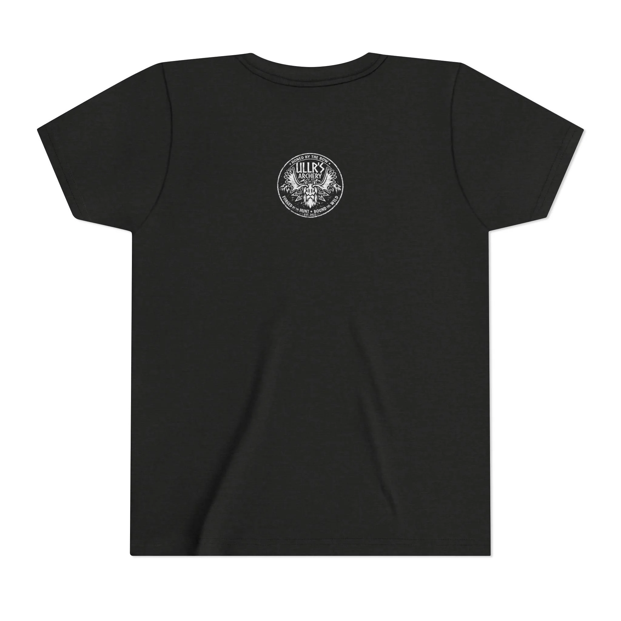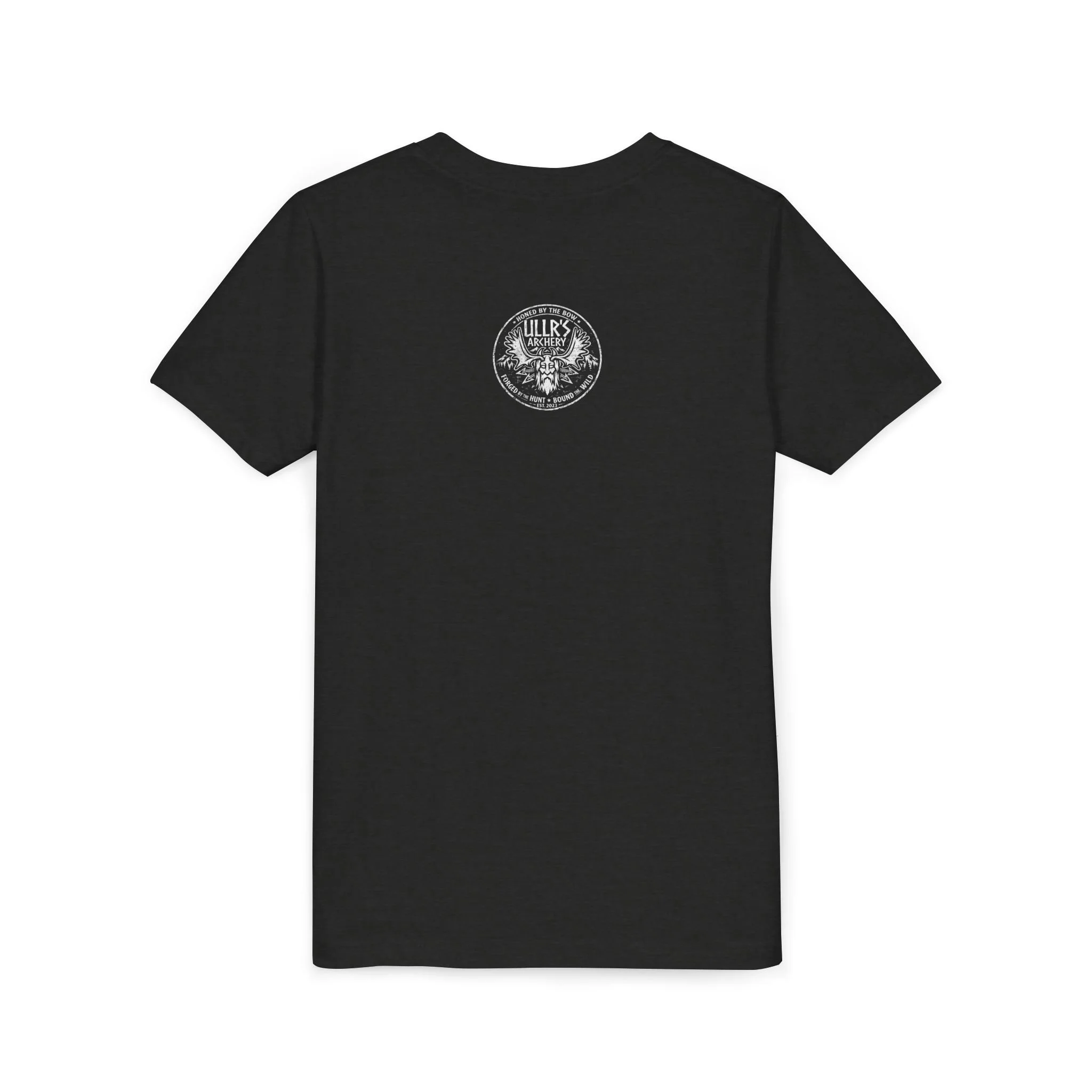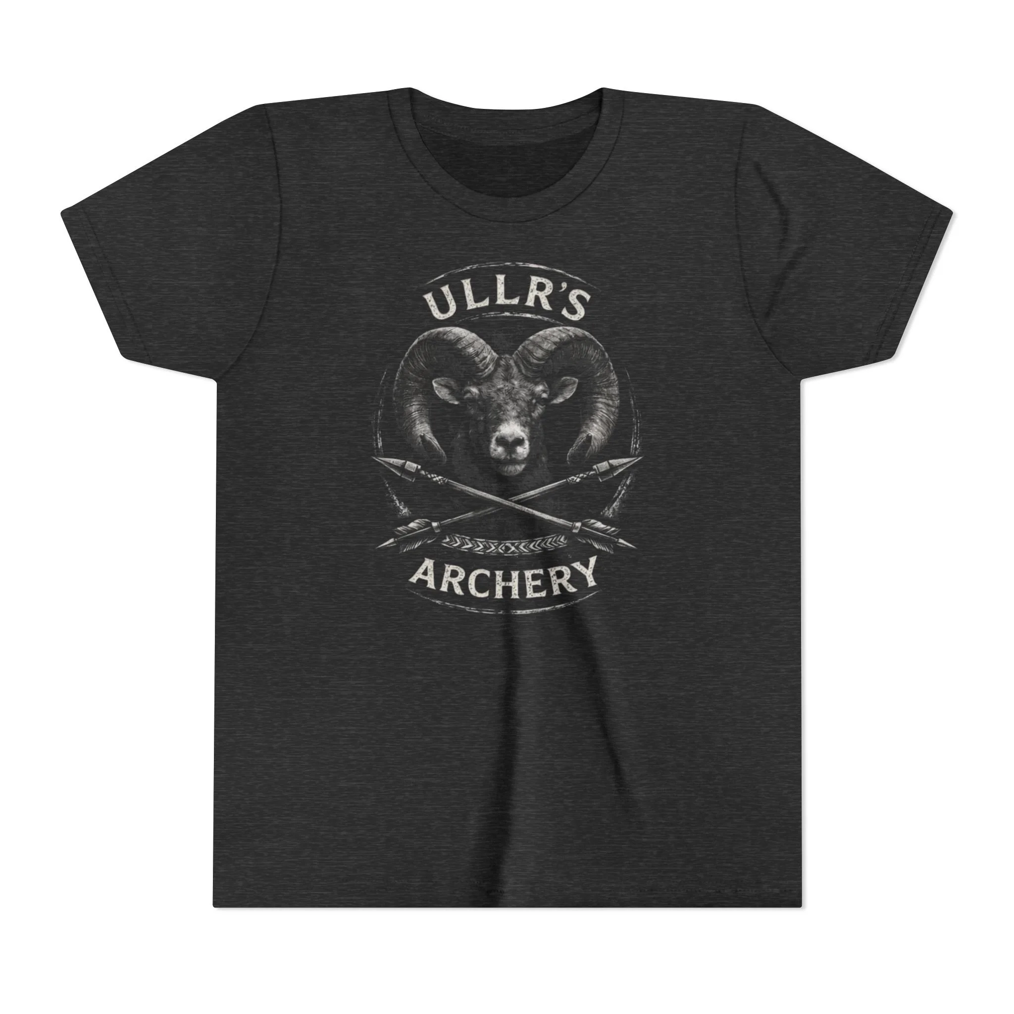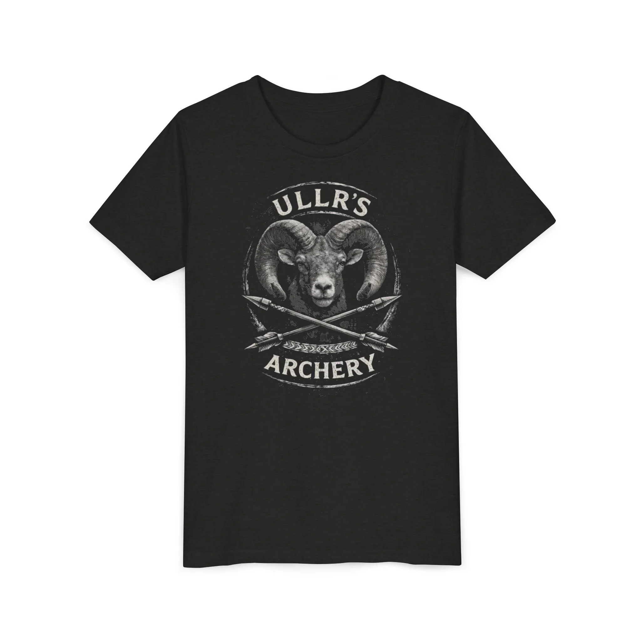 A lightweight youth tee printed with a weathered ram-and-crossed-arrows crest that reads “Ullr’s Archery.” Soft, airlume-combed cotton gives this shirt a lived-in feel right away. The subtle distressed graphic sits centered on the chest, muted so it reads like a badge earned on early mornings at the range. Side seams and shoulder tape keep the shape steady through play and practice. This tee slips on easily, breathes during warm days, and leaves room for movement while still looking clean and modern — a quiet way for young archers to show their passion.
