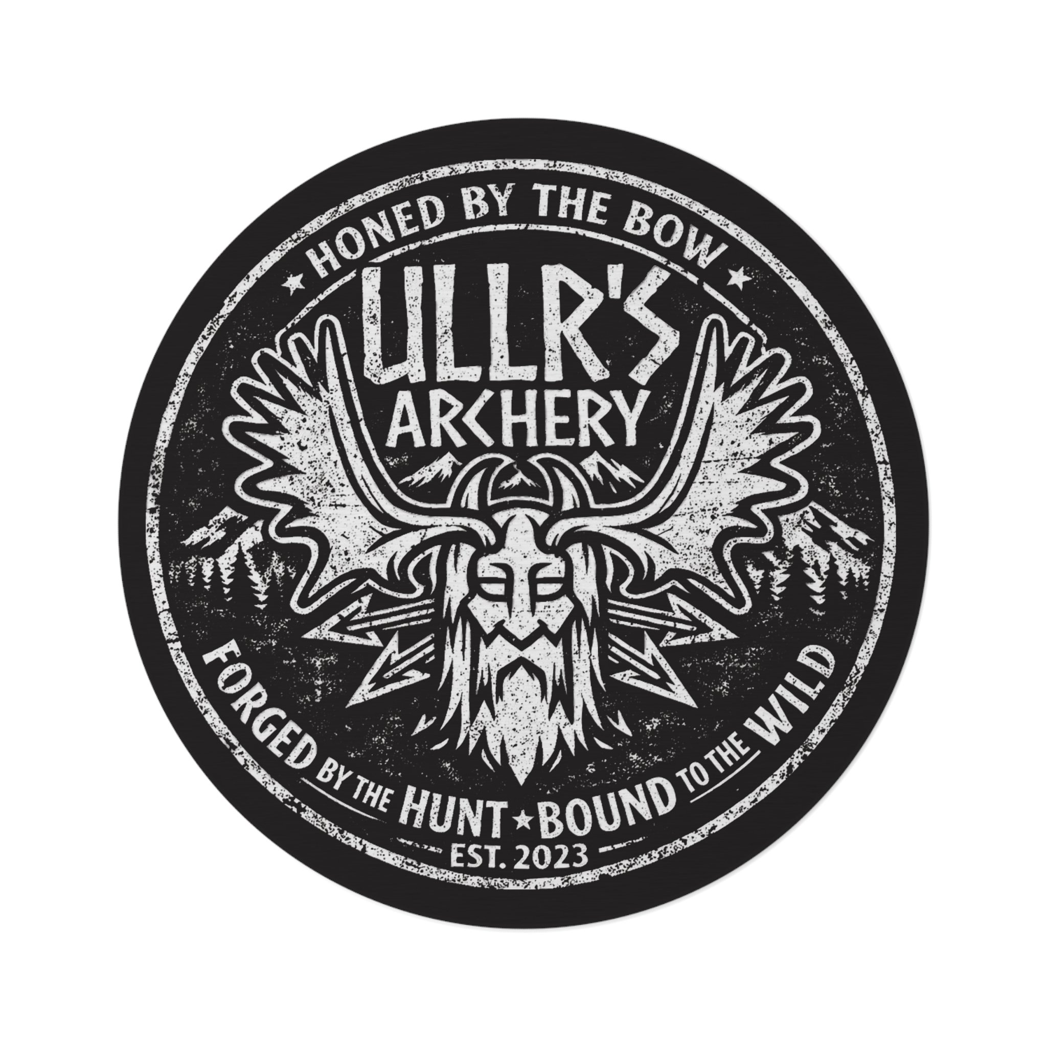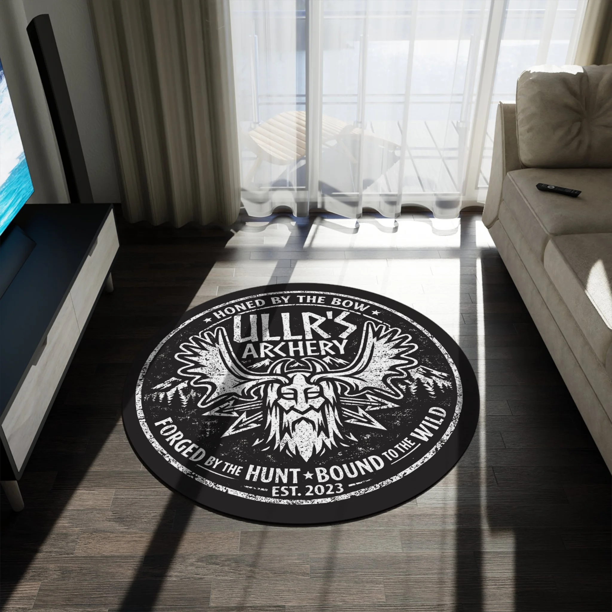 Bring a rugged, story-rich accent to your space with this round chenille rug. The bold Ullr’s Archery emblem—antlered helmet, distant pines, and weathered lettering—reads like a veteran hunter’s badge pinned to a cabin wall. Underfoot the plush 100% polyester chenille has a soft, inviting pile that resists pilling and keeps the printed details crisp. At 60" across, it anchors rustic corners, reading nooks, or entryways where the hunt, the woods, and evenings by the hearth shape everyday life. The hemmed edge and durable textured face mean the look endures through booted visits, muddy paws, and late-night storytelling. Wear in your living room, gear room, or cabin alcove to summon a sense of outdoor rites and long-standing craft.